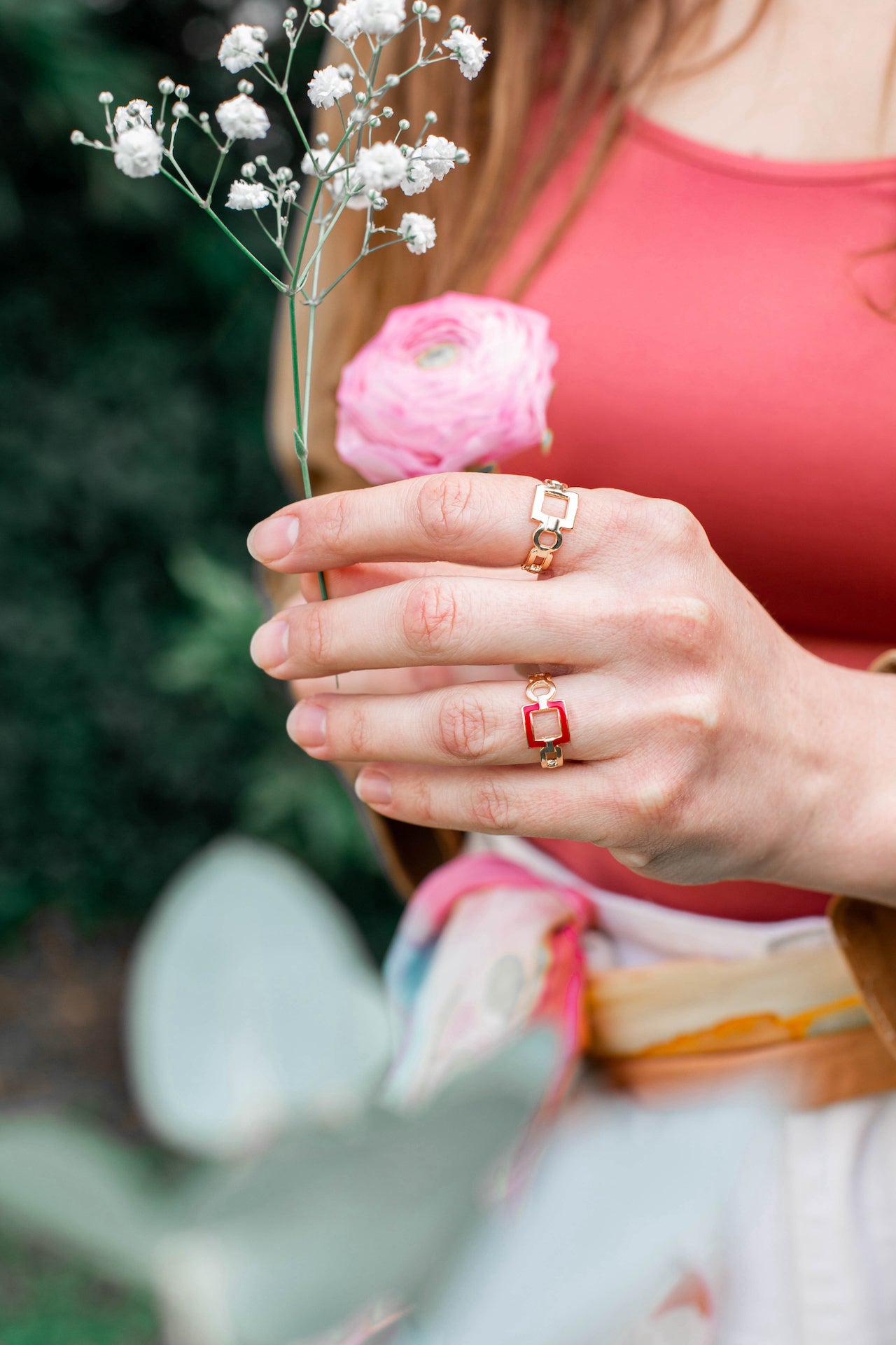 Nos bagues Lumio ont une base en étain recouverte d'une couche d'or 3 microns. Vous pouvez choisir votre bague avec ou sans émaillage rouge.