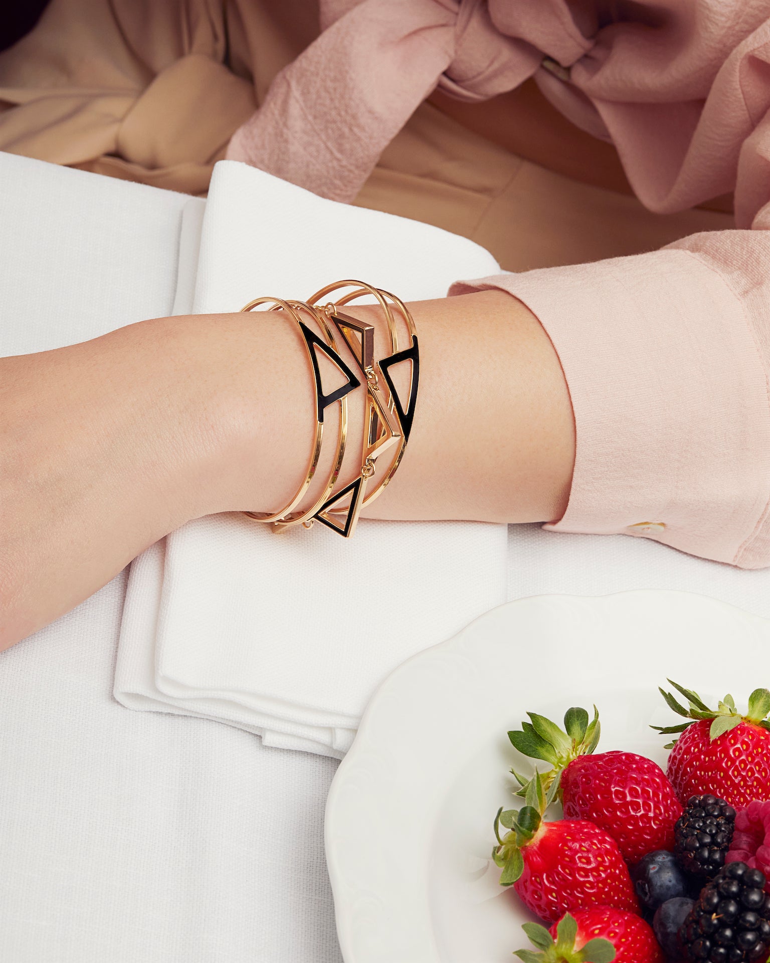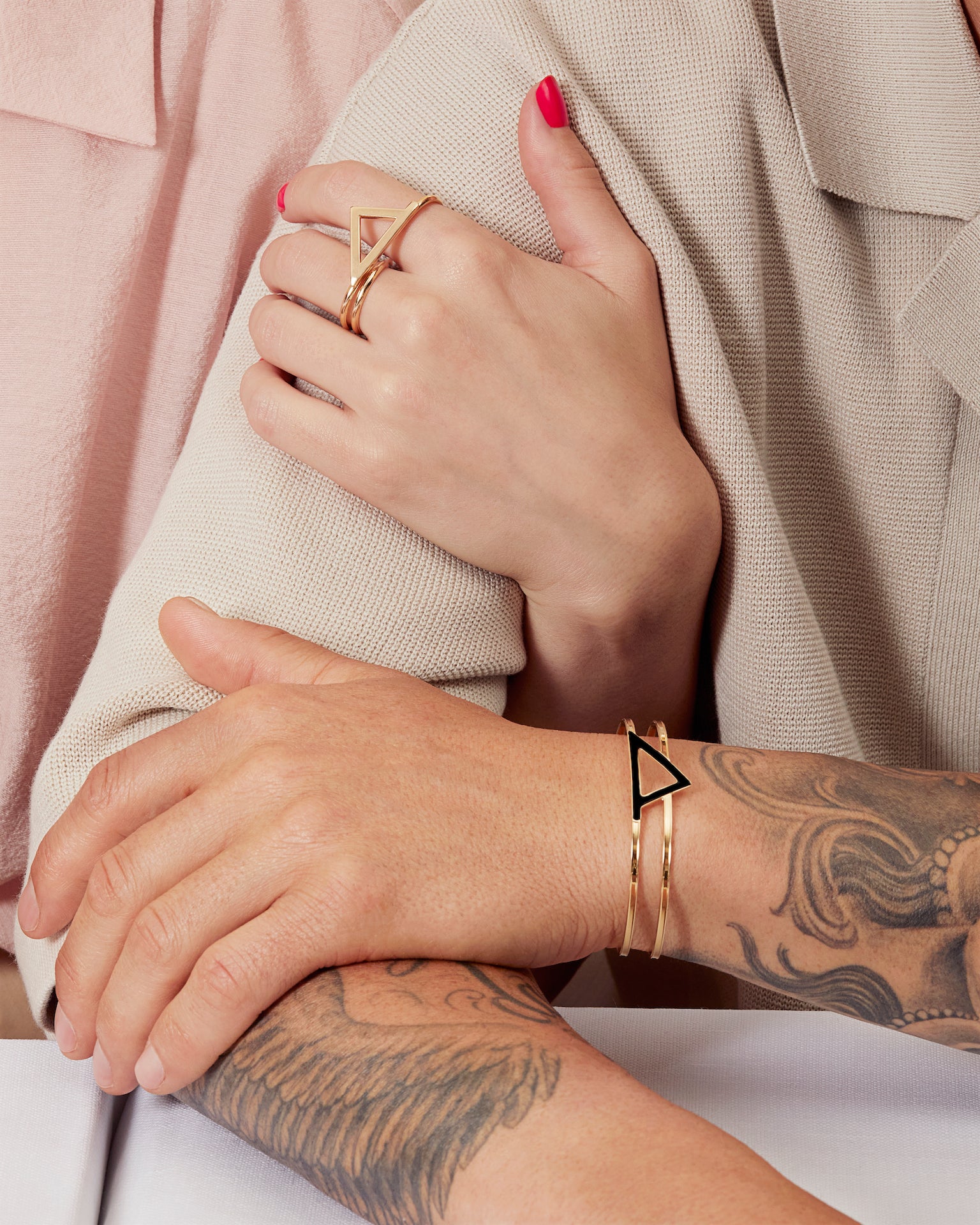 Jonc Cornuta avec une base en laiton plaqué à l'or 3 microns. Petit triangle émaillé en noir.